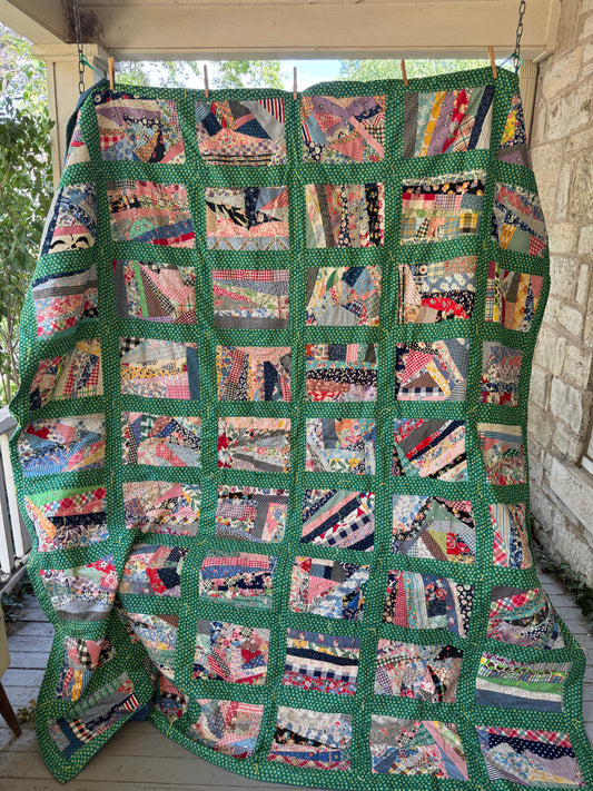 Vintage 1920s-30s Green Feedsack Crazy Tie Quilt