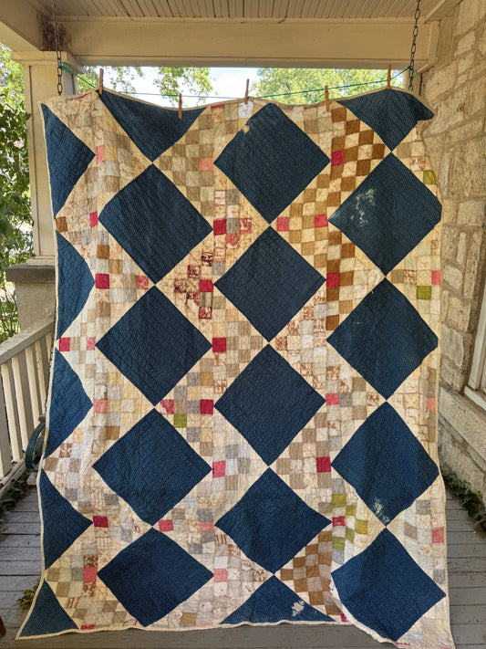 Antique 1840s-80s Indigo Square 9-Patch Variant Quilt