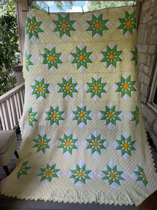Vintage 1950s-60s Yellow and Green 8-Point Star Flower Quilt