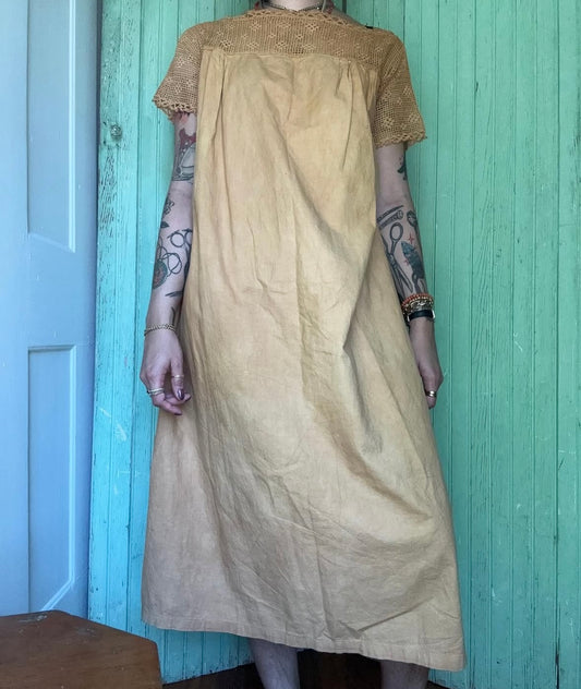 Antique Edwardian Crocheted Yoke Plant Dyed Mustard Yellow Nightgown